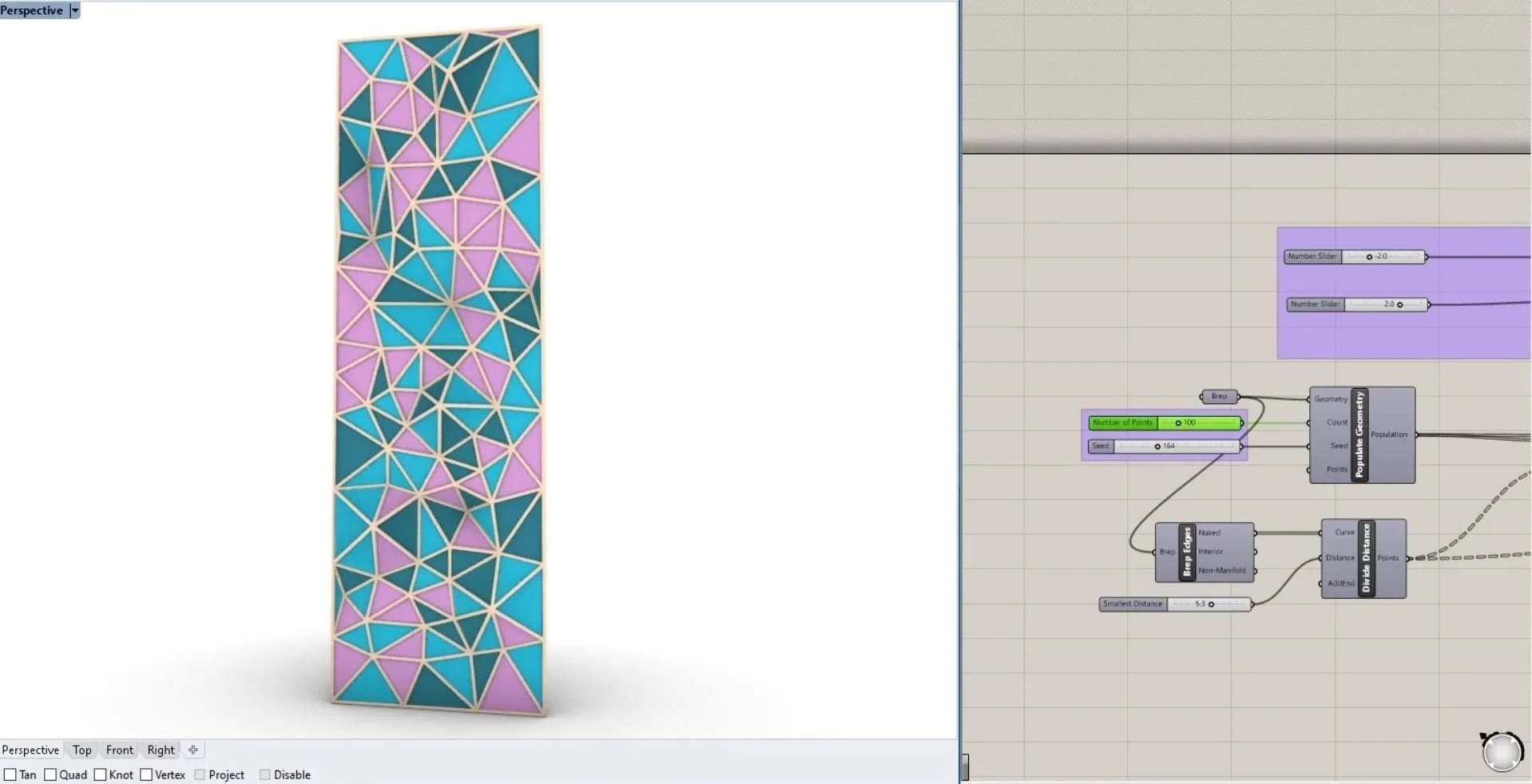 1_ The Delaunay Triangulation Façade Project is a randomized, triangulated pattern on a glass curtain panel that varies in depth. Grasshopper was used randomly populate points on a surface (which was pre-modeled in Rhino) and then used to connect these points using the Delaunay edge node. The aim was for a triangulated pattern that was not uniform in placement, but consistent in size. Additionally, three materials were randomly assigned to the triangles to create variation on the curtain panel.